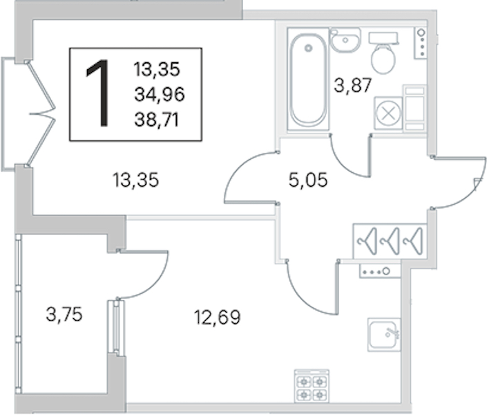 Однокомнатная квартира на 3-ем этаже 34,96 кв.м
