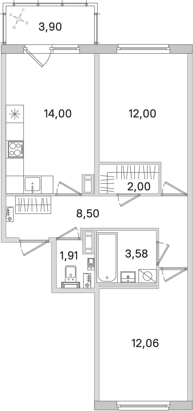 Двухкомнатная квартира на 4-ом этаже 54,05 кв.м