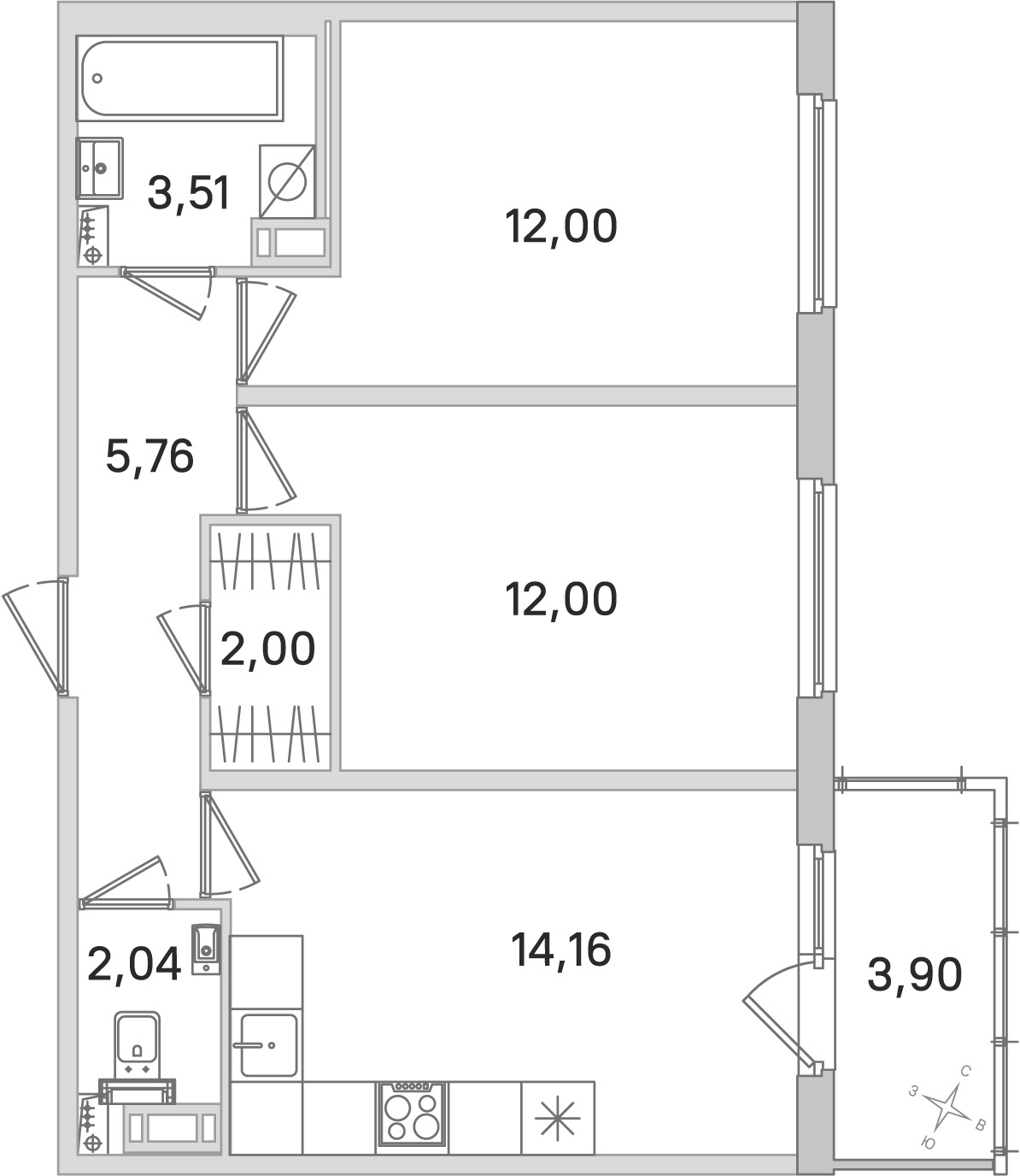 Двухкомнатная квартира на 4-ом этаже 51,47 кв.м