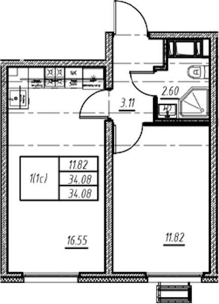 Однокомнатная квартира на 4-ом этаже 34,08 кв.м