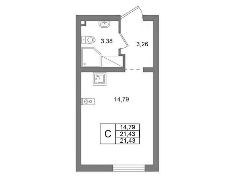 Квартира-студия на 6-ом этаже 21,43 кв.м
