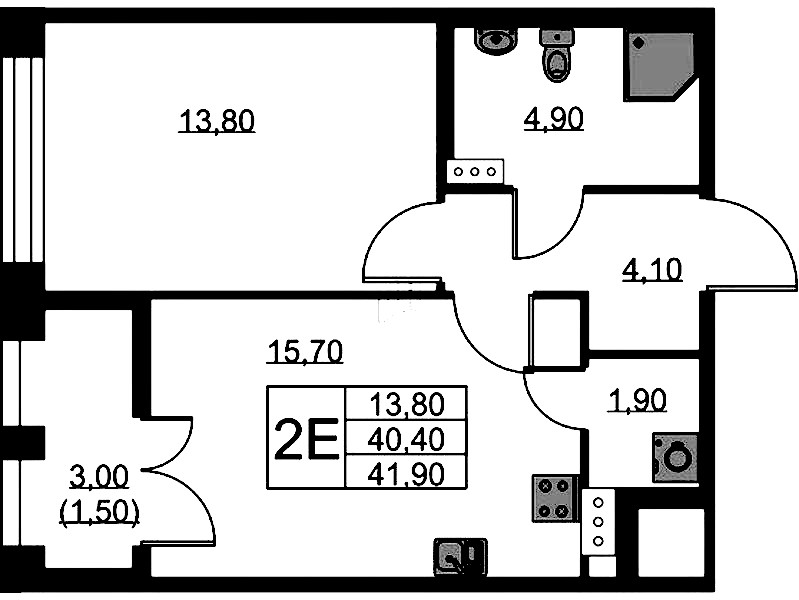 Однокомнатная квартира на 6-ом этаже 41,9 кв.м