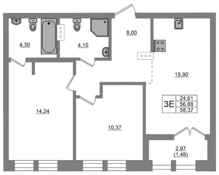 Двухкомнатная квартира на 7-ом этаже 58,37 кв.м