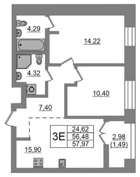 Двухкомнатная квартира на 2-ом этаже 57,97 кв.м