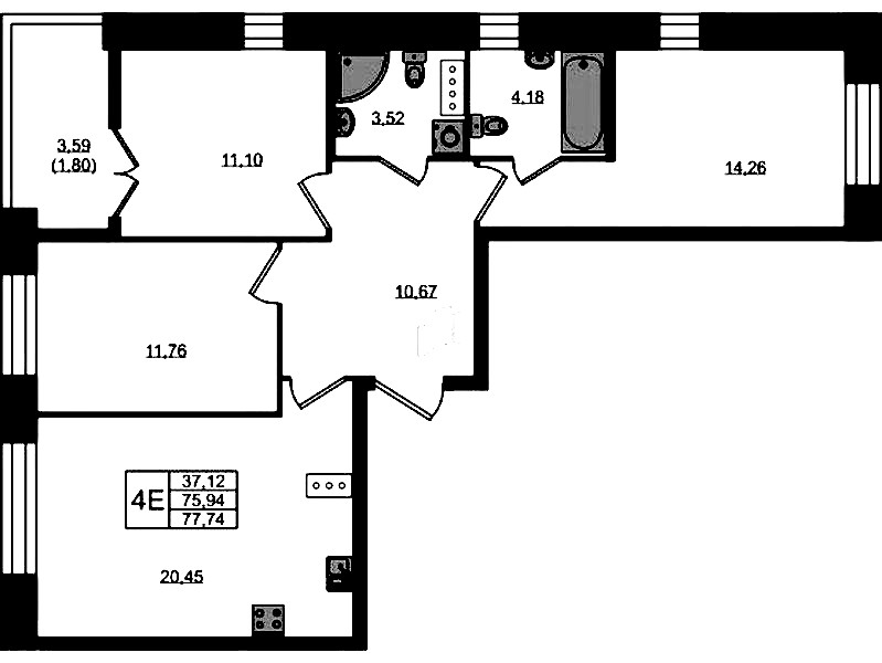 Трёхкомнатная квартира на 7-ом этаже 77,74 кв.м