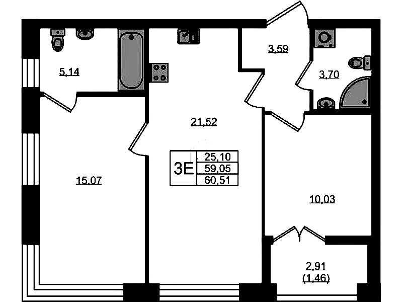 Двухкомнатная квартира на 2-ом этаже 60,51 кв.м