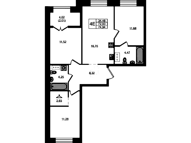 Трёхкомнатная квартира на 4-ом этаже 74,94 кв.м