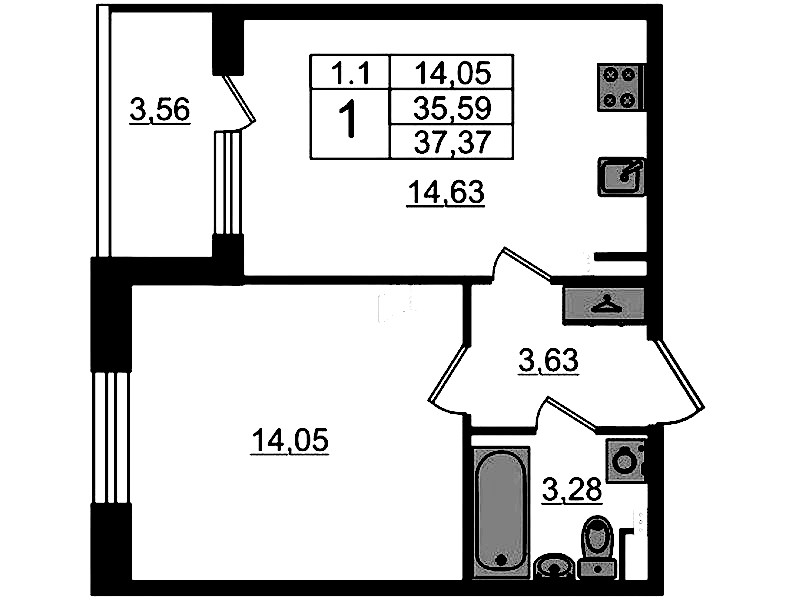 Однокомнатная квартира на 2-ом этаже 35,59 кв.м