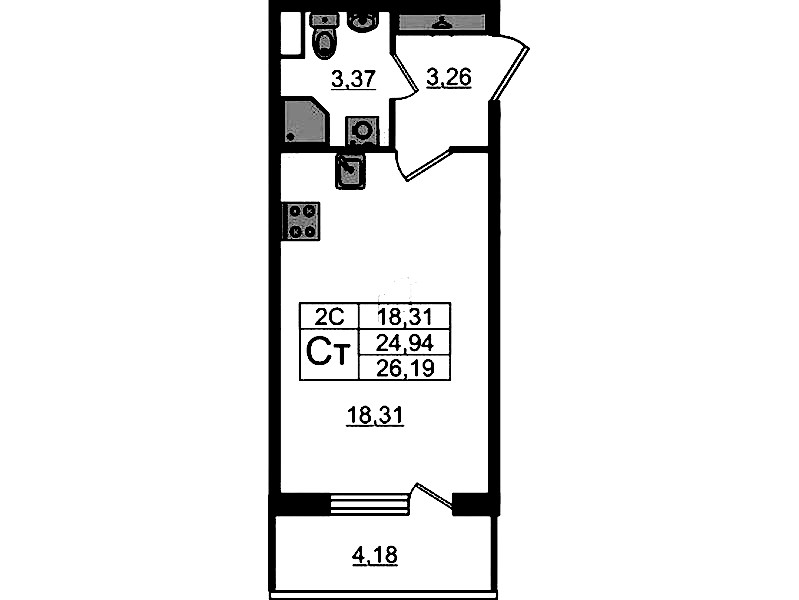 Квартира-студия на 2-ом этаже 24,94 кв.м