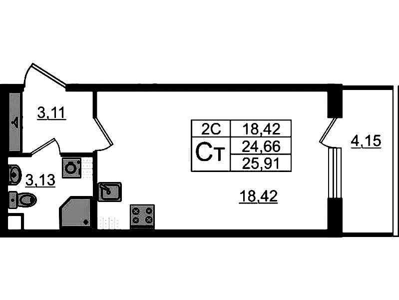 Квартира-студия на 5-ом этаже 24,66 кв.м