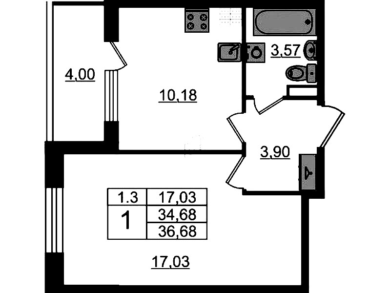 Однокомнатная квартира на 4-ом этаже 34,68 кв.м