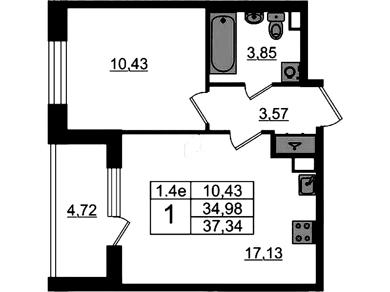 Однокомнатная квартира на 2-ом этаже 34,98 кв.м