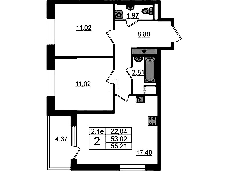 Двухкомнатная квартира на 2-ом этаже 53,02 кв.м