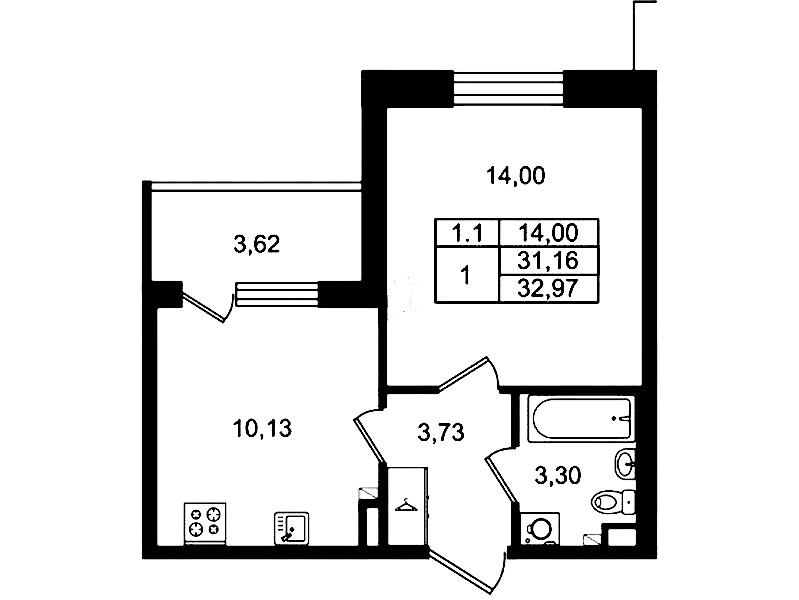 - Площадь кухни10,13 м2