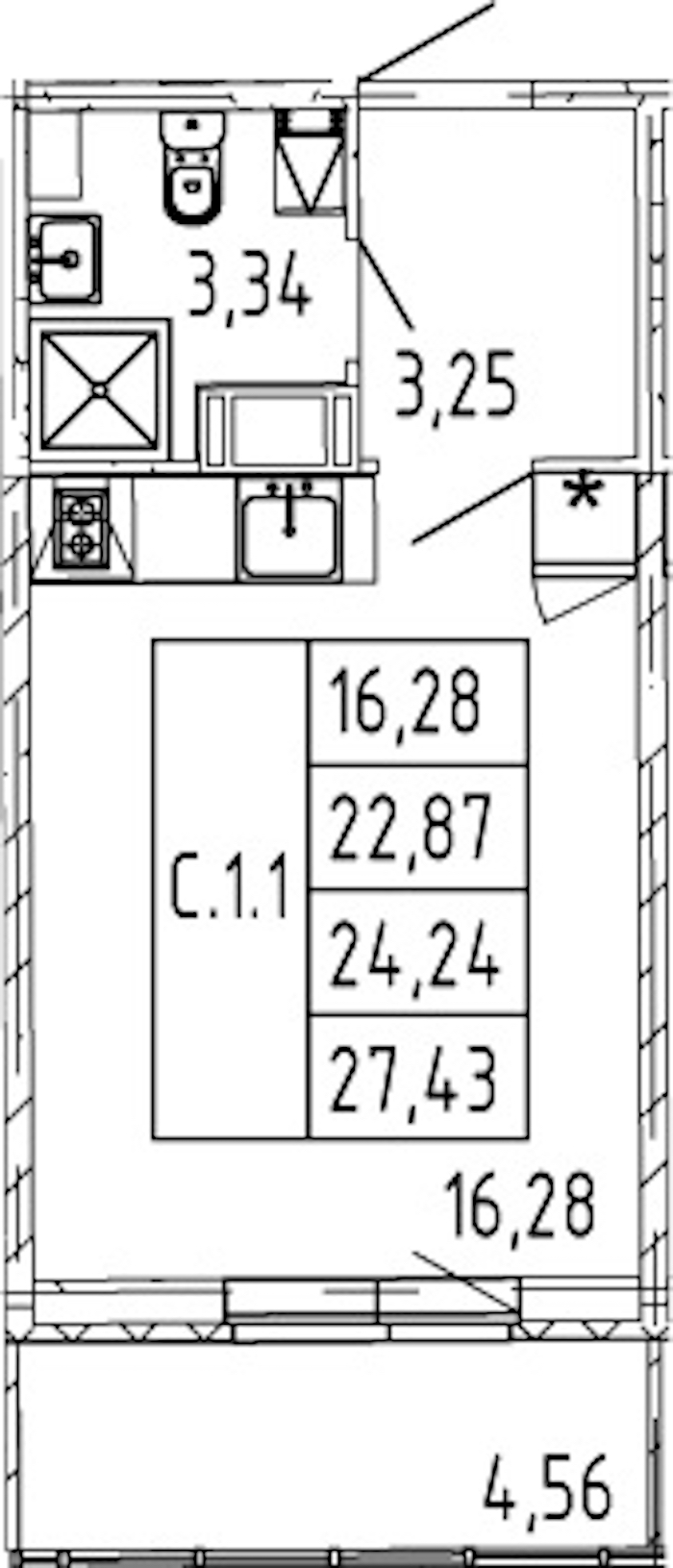 Квартира-студия на 3-ем этаже 22,87 кв.м