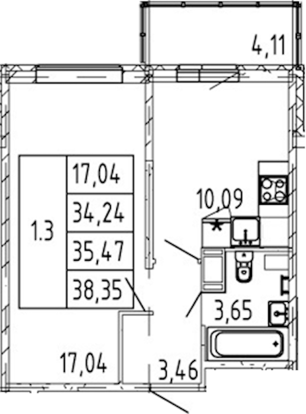 Однокомнатная квартира на 10-ом этаже 34,24 кв.м