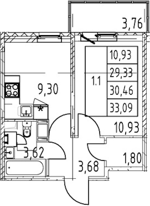 Однокомнатная квартира на 12-ом этаже 30,46 кв.м