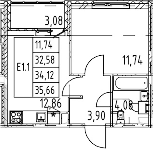- Площадь кухни12,86 м2