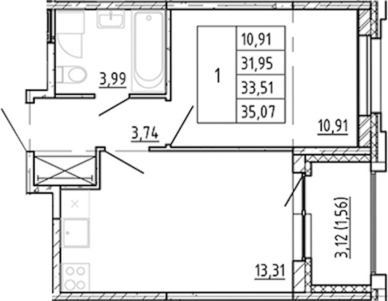 - Площадь кухни13,31 м2