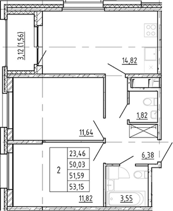Двухкомнатная квартира на 2-ом этаже 50,03 кв.м