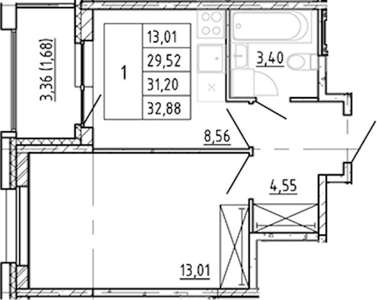Однокомнатная квартира на 4-ом этаже 29,52 кв.м