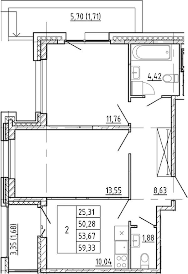 Двухкомнатная квартира на 11-ом этаже 50,28 кв.м