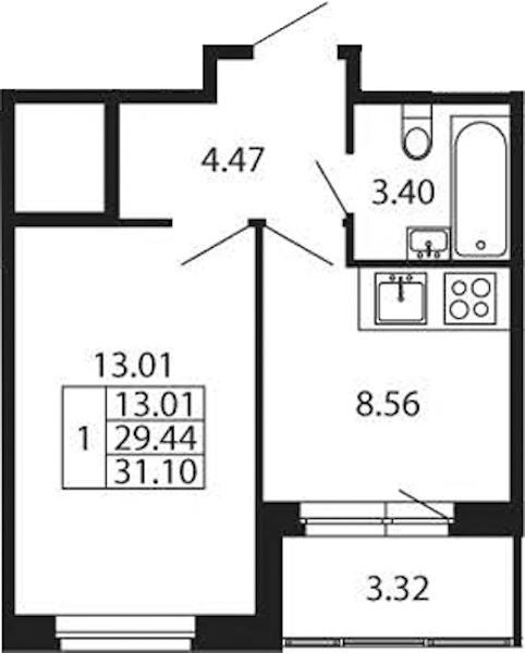 Однокомнатная квартира на 6-ом этаже 29,44 кв.м