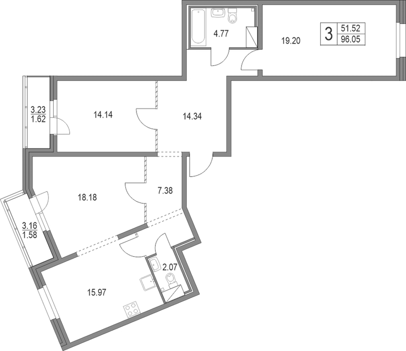 Трёхкомнатная квартира на 2-ом этаже 96,05 кв.м