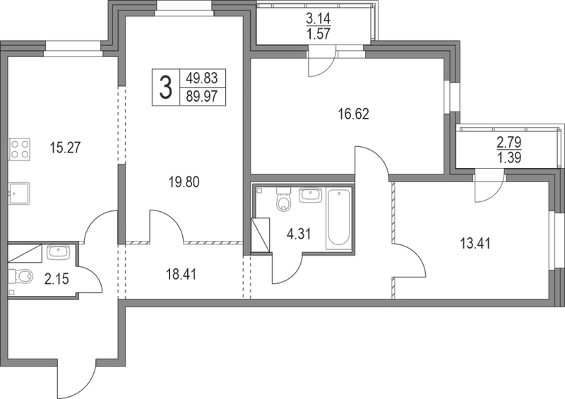 - Площадь кухни15,27 м2