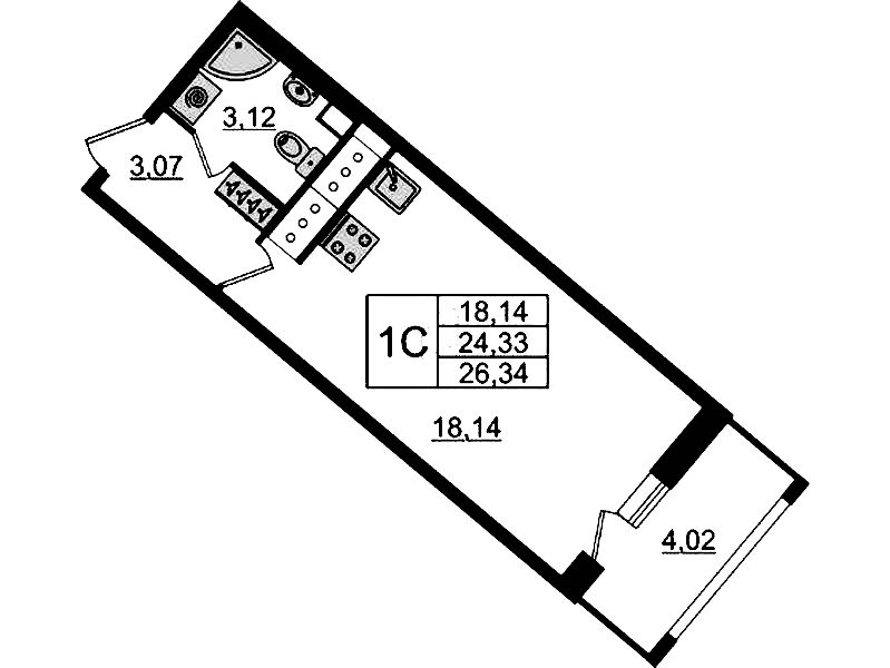 Квартира-студия на 18-ом этаже 24,3 кв.м