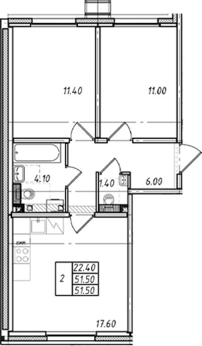 Двухкомнатная квартира на 1-ом этаже 51,5 кв.м