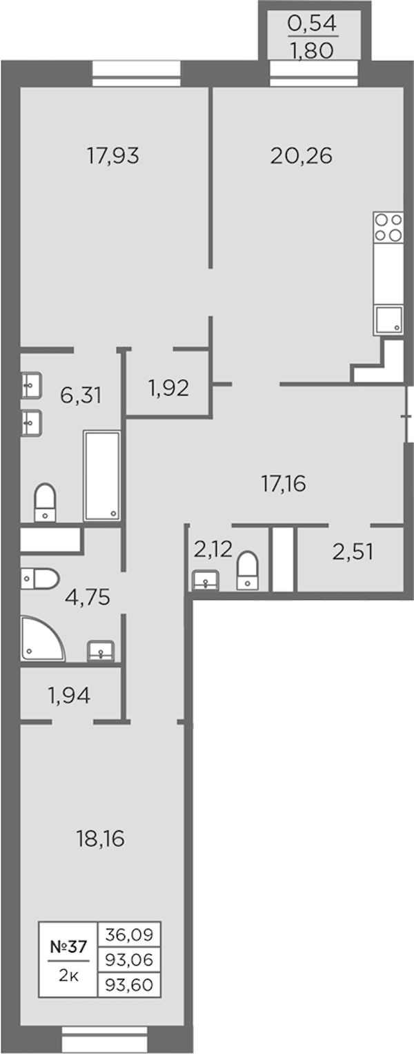 Двухкомнатная квартира на 4-ом этаже 93,6 кв.м