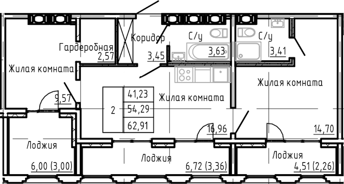 Двухкомнатная квартира на 20-ом этаже 62,91 кв.м