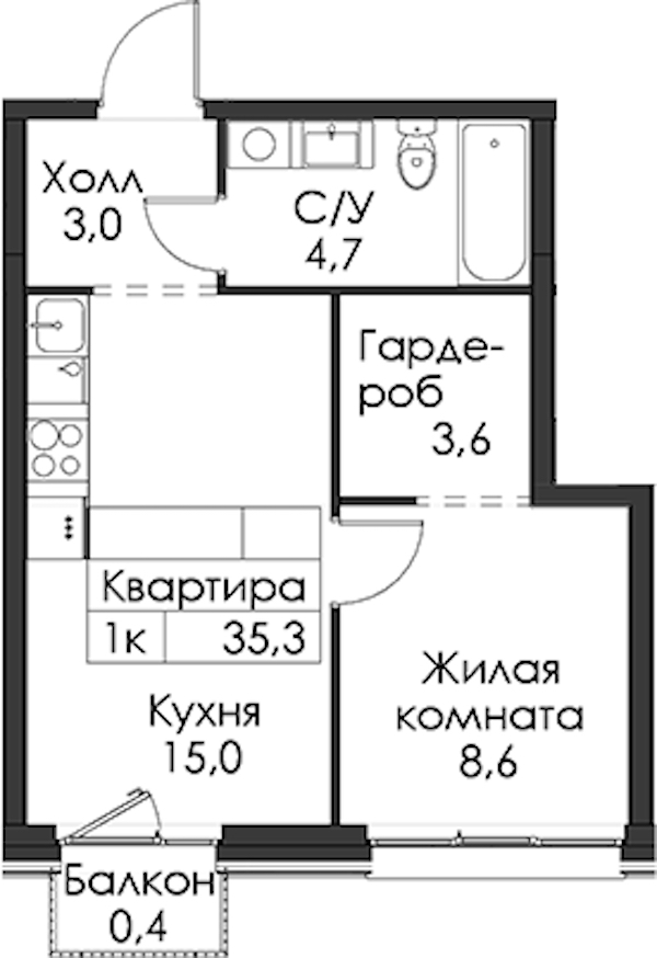 - Площадь35,3 м2