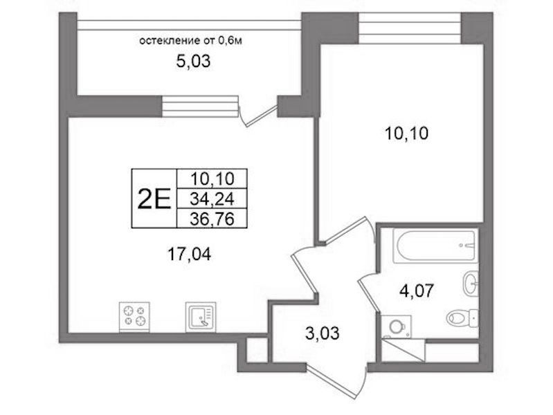 Однокомнатная квартира на 4-ом этаже 34,24 кв.м