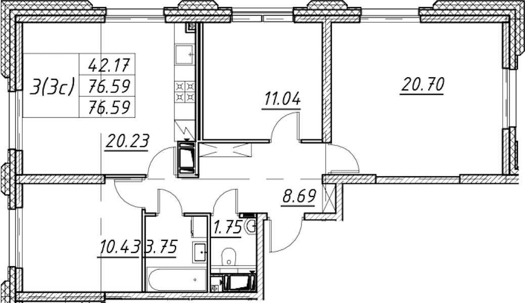 Трёхкомнатная квартира на 3-ем этаже 76,59 кв.м
