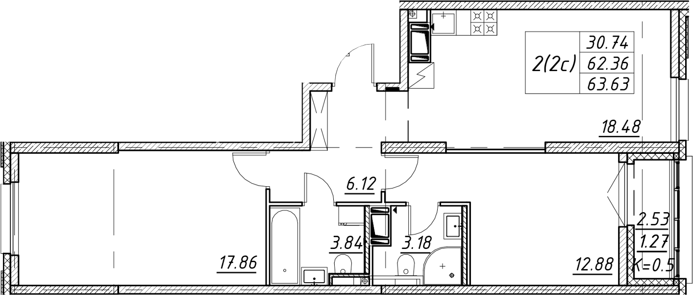- Площадь63,63 м2