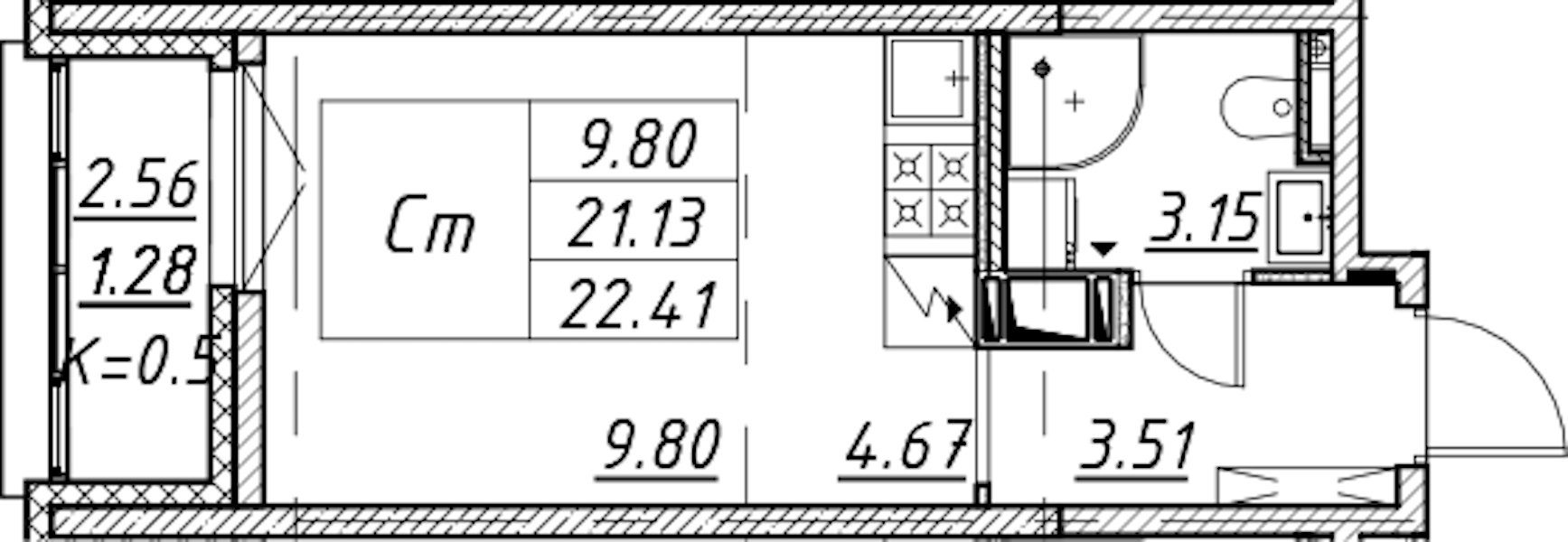 - Площадь22,41 м2