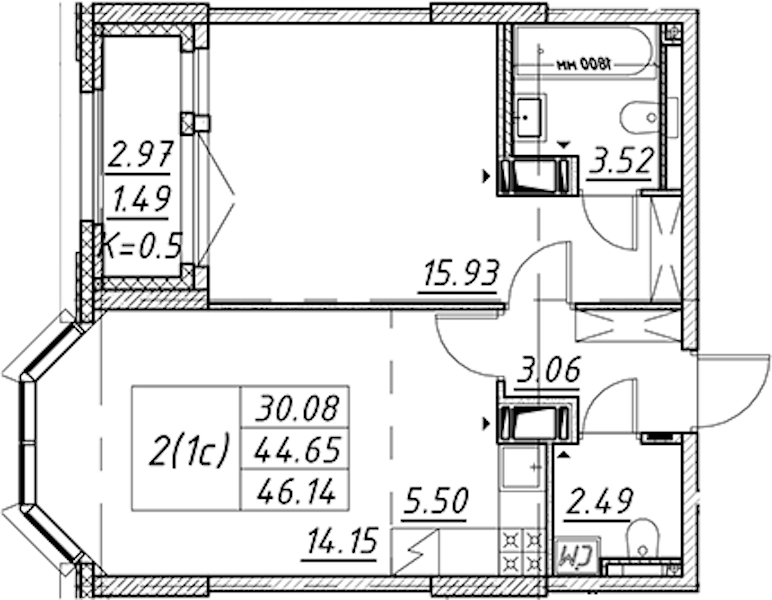 • Площадь46,14 м2
