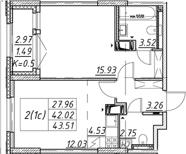 - Площадь43,51 м2