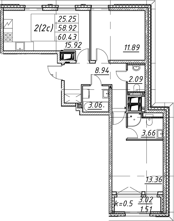 - Площадь60,43 м2