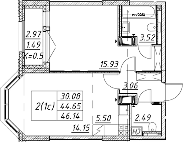 Однокомнатная квартира на 9-ом этаже 46,14 кв.м