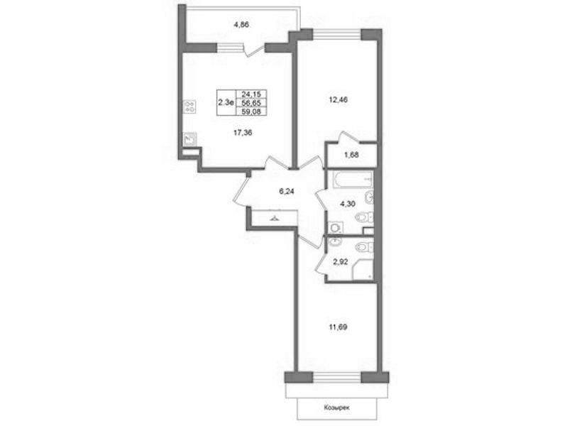 Двухкомнатная квартира на 2-ом этаже 56,65 кв.м