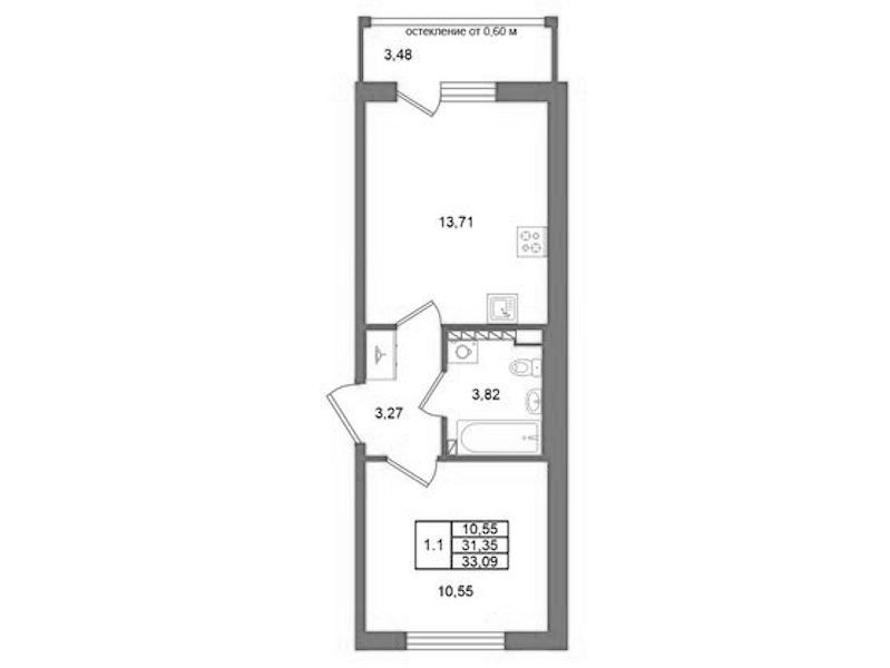Однокомнатная квартира на 4-ом этаже 31,35 кв.м
