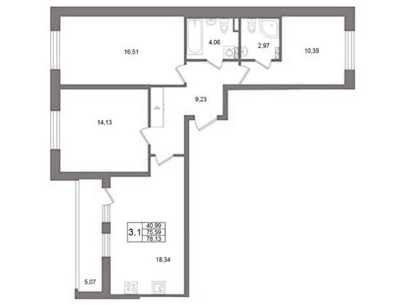Трёхкомнатная квартира на 3-ем этаже 75,59 кв.м