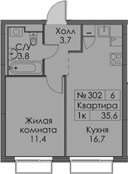 Однокомнатная квартира на 4-ом этаже 35,6 кв.м