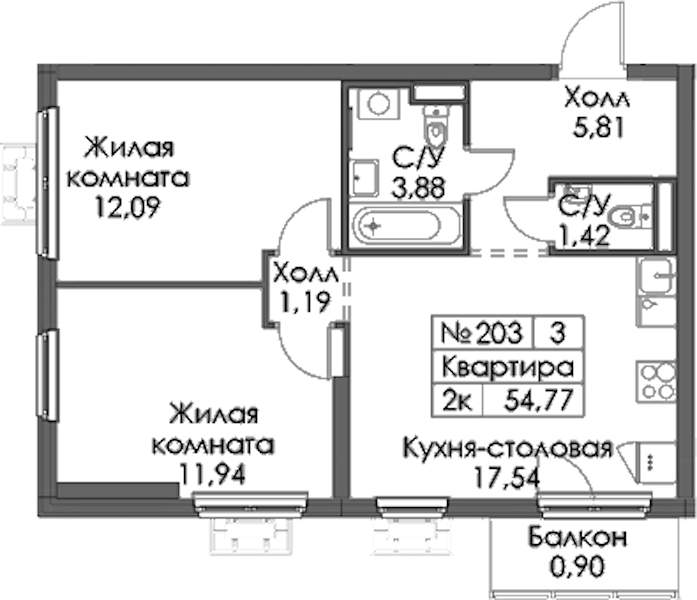 - Площадь54,77 м2