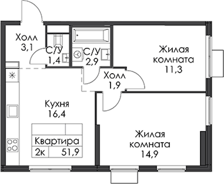 - Площадь51,9 м2